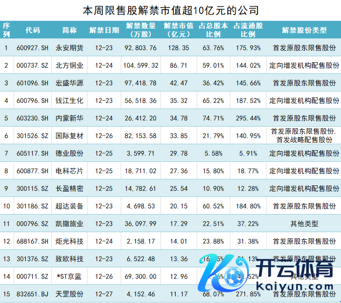 本周解禁市值杰出10亿元的公司有15家,前三辩认为永安期货(600927.SH)、朔方铜业(000737.SZ)和宏盛华源(601096.SH)。解禁数目杰出1亿股的公司共12家,前三一样是上述三家公司。